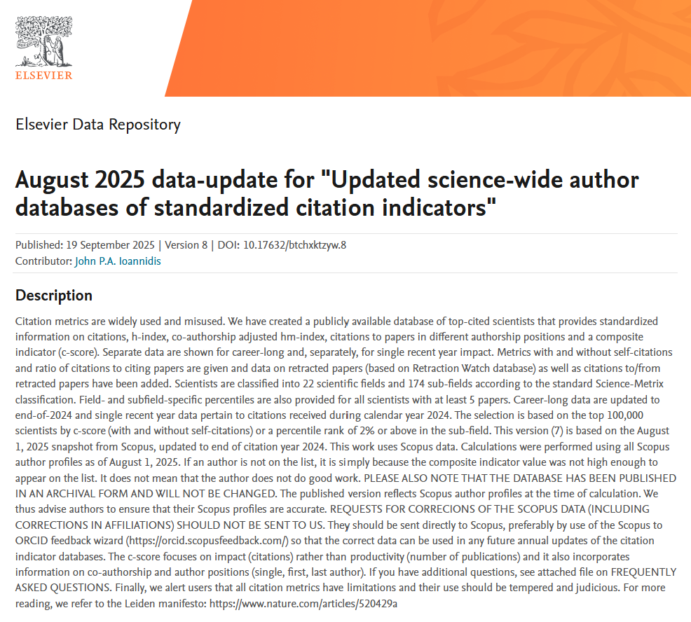 据了解,全球前2%顶尖科学家榜单分为“终身科学影响力排行榜(Career-long Impact)”和“年度科学影响力排行榜(Single-year Impact)”两大部分。其中,终身科学影响力排行榜统计科学家整个职业生涯的学术表现;年度科学影响力排行榜则聚焦上一年度的学术影响力,具有极高的权威性。此次入选科学家是从全球近700万名科研人员中筛选,通过论文引用数、H指数、合著者修正HM因子、第一或单独作者的引用数等综合指标排序,在22个大领域和174个子领域中遴选出的世界排名前2%科学家,具有广泛的影响力。